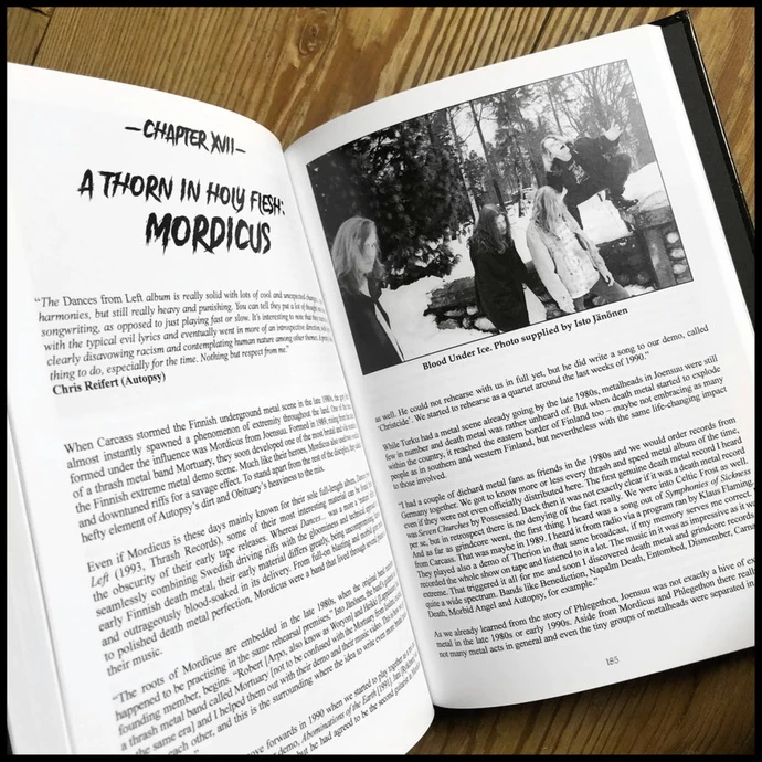 Description:ROTTING WAYS TO MISERY: THE HISTORY OF FINNISH DEATH METAL hardback bookWritten by Markus Makkonen and Kim Strömsholm.Full-length book, 300 pages, hardback covers.This is the definitive guide to the magical and morbid Finnish death metal scene! This 300 page tome explores the explosive scene of the early 90s, while also covering the pre-death metal extreme / thrash metal scene in Finland, as well as the genre’s resurrection.Full of unseen photos and long and exclusive interviews with multiple members of legendary bands such as AMORPHIS, SENTENCED, PHLEGETHON, XYSMA, THERGOTHON, FUNEBRE, DEMILICH, DEMIGOD, PURTENANCE, MORDICUS, DISGRACE, NECROPSY, ROTTEN SOUND and ABHORRENCE, plus more cult and seminal acts such as NATIONAL NAPALM SYNDICATE, FESTERDAY, FAFF BEY, MENGELE, MAPLE CROSS, A.R.G., PUTRID, CONVULSE, CARTILAGE, INFERIA, COFFIN, MYTHOS, LUBRICANT, COMEBACK RECORDS and more.The book also features contributions from outside of the scene from peers and admirers of Finnish death metal including members ofAUTOPSY, AT THE GATES, MISERY INDEX, THE HAUNTED, BENEDICTION, ASPHYX, ENTRAILS, BLACK CRUCIFIXION, TEITANBLOOD, UNCOFFINED, ANATOMY and many, many more.